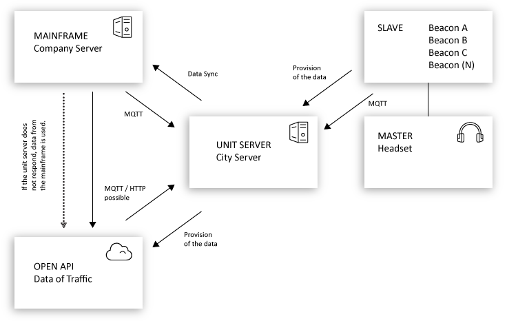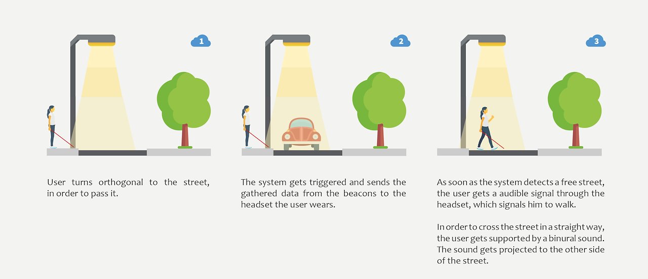 In order to use the system, it is assumed that (free) internet-hotspots are available throughout the city to provide the most flexible system possible. The headset of the user constantly records the information from the beacons and therefore knows which direction the visually impaired has to face until the system “speaks up”. If the user turns into the offset area (+/- 20 ° of the target direction), the system activates and plays the sound of a traffic light system. Machine learning allows the beacon to analyze in real time, in combination with a connected camera, whether the street is free for the blind or not.