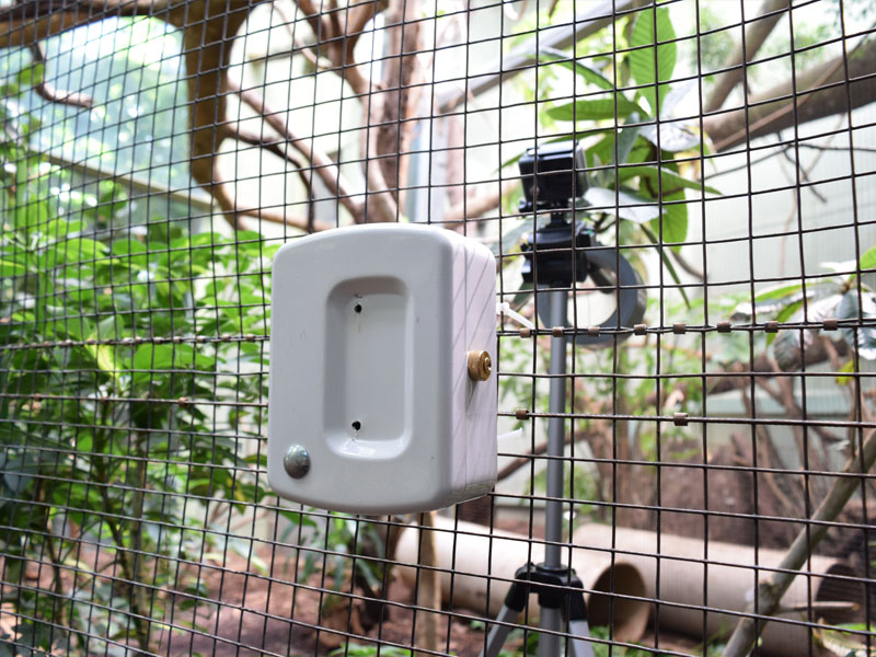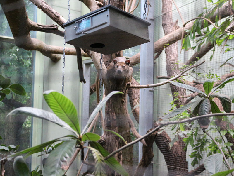 Randomly distributed throughout the day, the sound of a prey is reproduced from one of the loudspeakers. If the animal goes in search of clues and follows the sound to its source, the vocal stops and is immediately heard from another corner, from another speaker. The fossa can chase the sound for a while, until it finally lands at the feeder. There, a small feed portion is released.