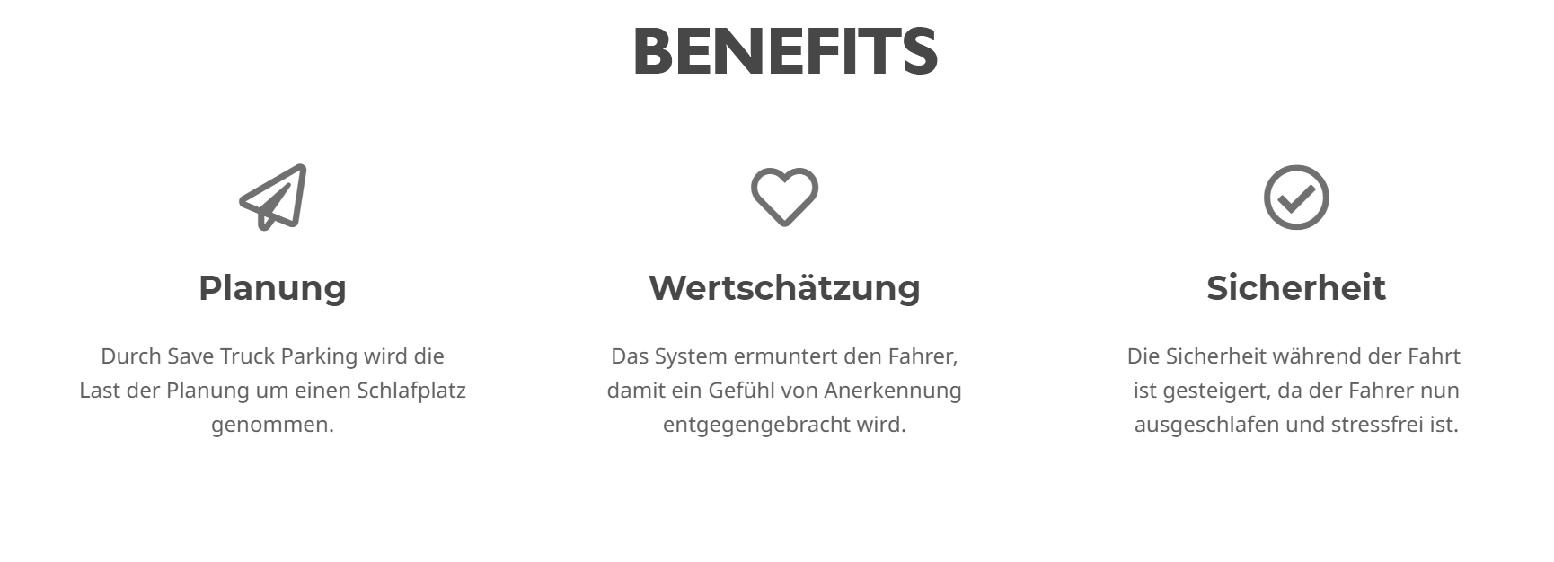 With Save Truck Parking, the truck driver reserves safe parking spaces at truck stops and at the same time receives appreciation for his job. By reducing stress and time while looking for a parking space, the truck driver has more attention and balance for the subsequent journey. The result is a well rested truck driver who can concentrate on the traffic without stress.